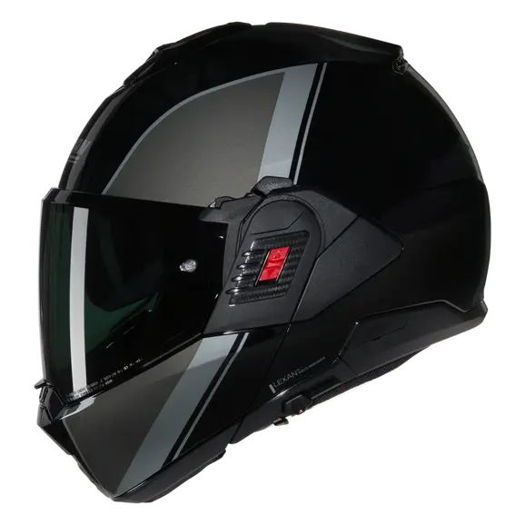 Nolan conquista il mondo dei modulari grazie all’esclusivo flip-back N120-1, un casco che rappresenta l'apice della tecnologia, dell’innovazione e del design, nato per rispondere alle esigenze di un mercato sempre più orientato alle moto crossover. Con questo modulare a doppia omologazione, integrale (P) e Jet (J) e mentoniera reversibile fino a 180°, Nolan rompe gli schemi con l’innovativo concetto di tecnologia flip-back. Il sistema di apertura della mentoniera, che prende il nome di Dual Action, ovvero doppia leva, rappresenta una delle peculiarità più importanti per questo modello, con un’apertura e una chiusura semplice e fluida. Una profonda esplorazione è stata fatta anche nella realizzazione di varianti grafiche e colori, con nuance uniche come ad esempio il sabbia, l’ocra, il rosso viscerale e accostamenti ricercati con blocchi colore o ancora, applicazioni d’avanguardia che miscelano colori e decalcomanie. L’equilibrio cromatico ed eleganza sono mantenuti in ogni configurazione d’utilizzo. N120-1 accoglie il sistema di comunicazione N-Com.